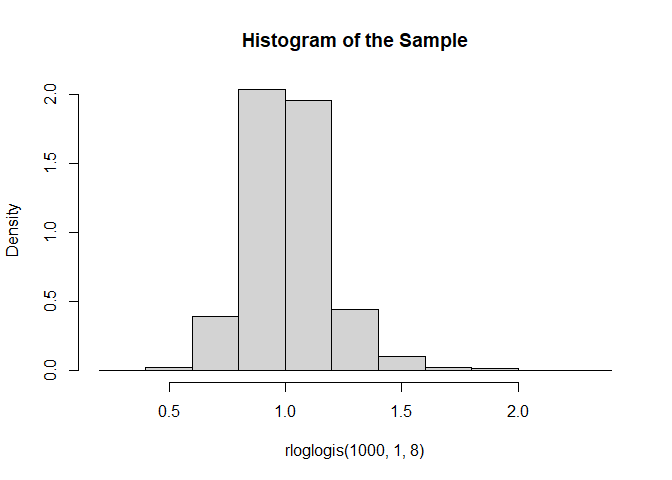 Function rloglogis generates random data following a Log-logistic distribution with parameters scale and shape.